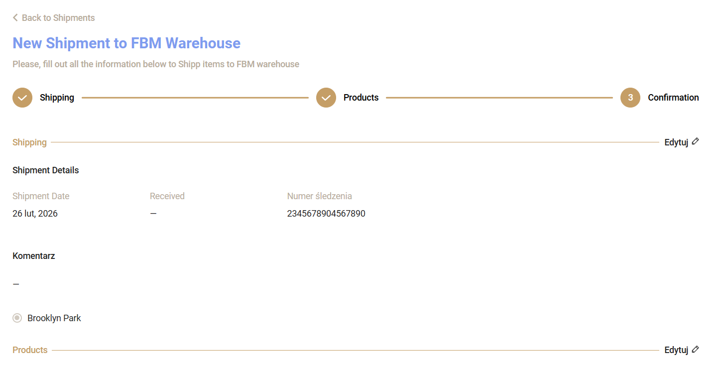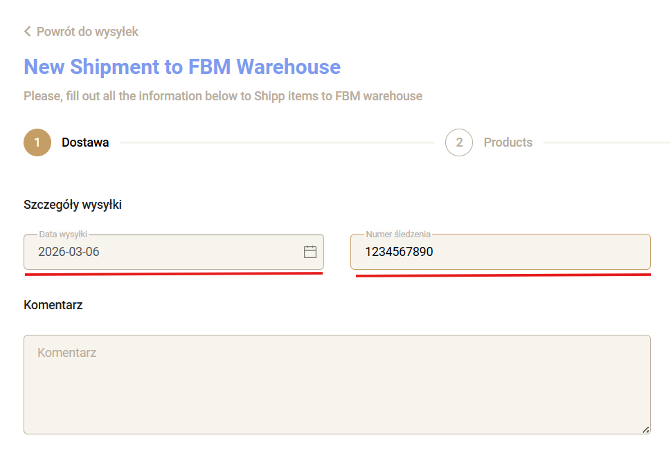 Wskaż datę wysyłki paczki do magazynu w USA, numer przesyłki i, w razie potrzeby, dodaj komentarz.