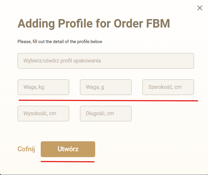Wprowadź nazwę profilu, podaj wymagane wymiary i kliknij przycisk „Utwórz”