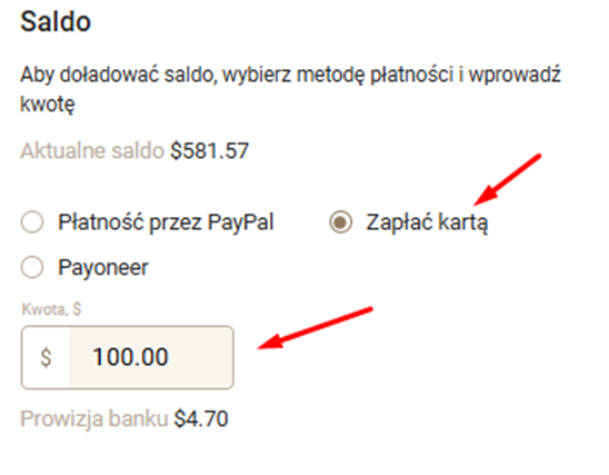 Aby doładować saldo kartą, w panelu informacyjnym na koncie osobistym wybierz opcję „Zapłać kartą” i wprowadź kwotę w USD, o którą chcesz doładować konto.