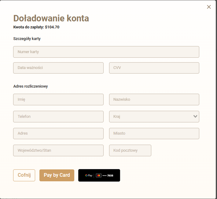 Istnieje również możliwość płatności przez Google Pay — w tym celu kliknij odpowiedni przycisk G Pay.