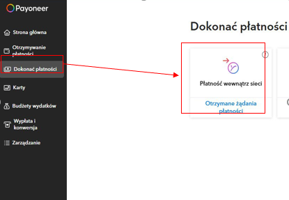 Aby środki zostały automatycznie zaksięgowane na Twoim koncie w systemie SkladUSA, należy najpierw wykonać przelew w opcji „Płatność wewnątrz sieci” w systemie Payoneer.