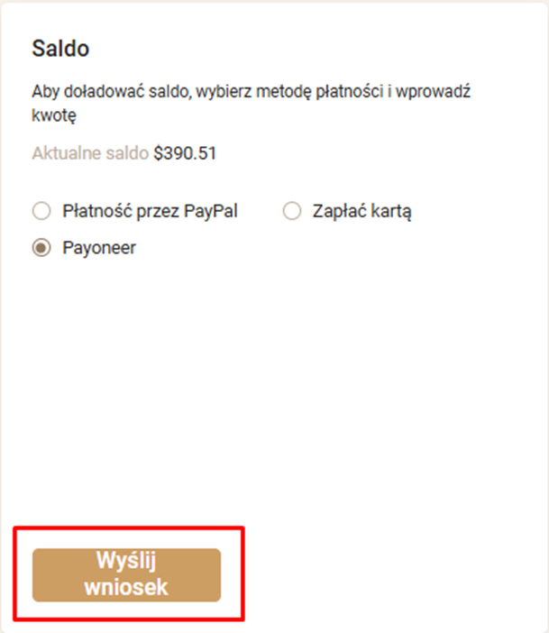 Kolejnym krokiem po dokonaniu przelewu przez Payoneer jest utworzenie wniosku o doładowanie salda – na panelu użytkownika SkladUSA, należy wybrać „Payoneer” i kliknąć przycisk „Wyślij wniosek”.