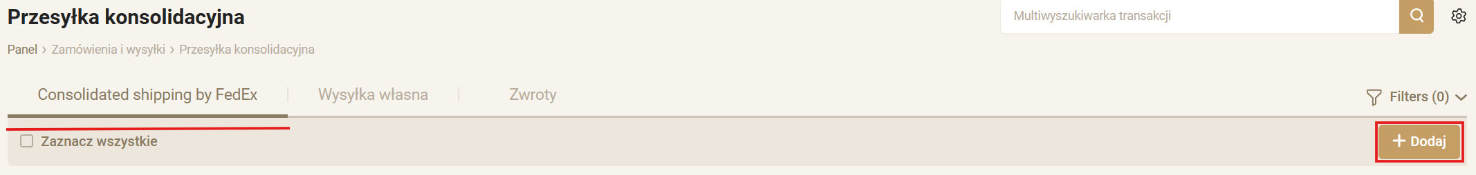 Przejdź do zakładki „Consolidated shipping by FedEx” i kliknij „+Dodaj”