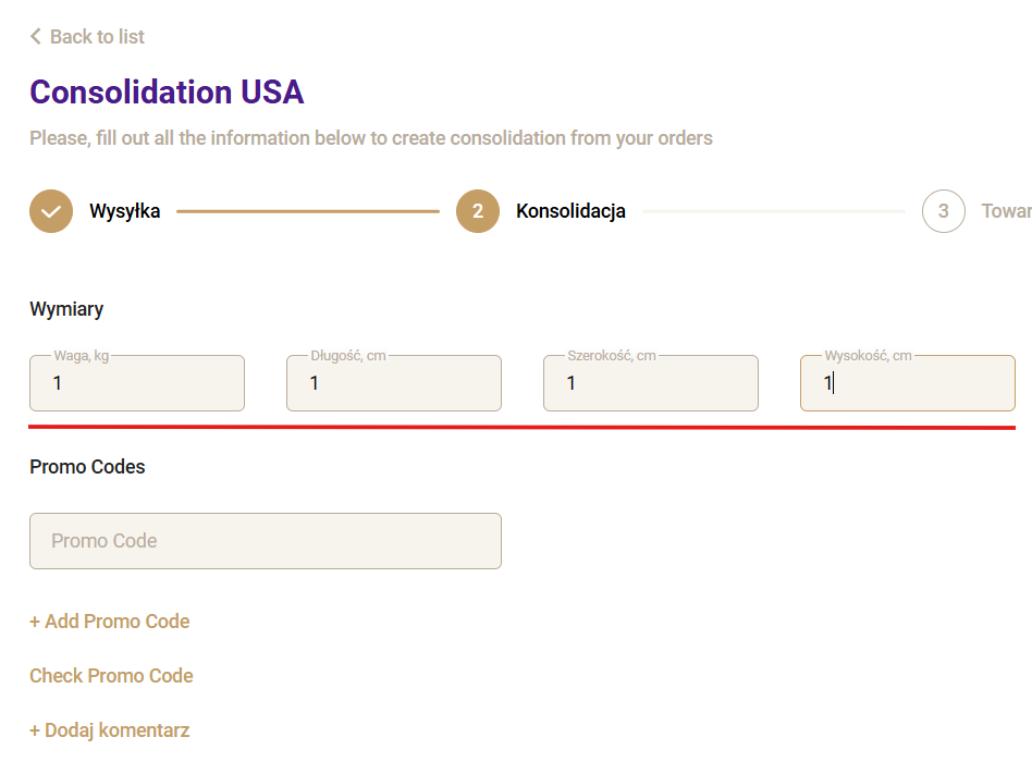 Następnie wpisz wymiary kartonu, w którym znajdują się wszystkie paczki.
