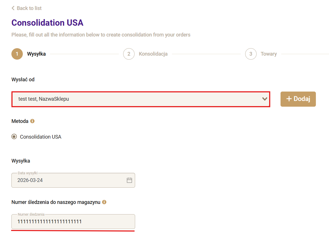 Wybierz nazwę użytkownika, od którego zostanie wysłana przesyłka, datę, kiedy zostanie ona wysłana od Ciebie. W polu „numer śledzenia” nie wpisuj nic.