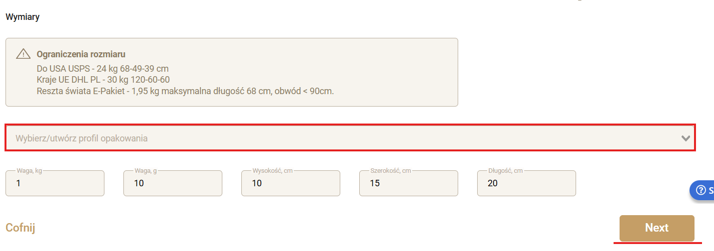 Wagę i wymiary przesyłki można wpisać ręcznie lub dodać szablon: Jak utworzyć profil pakowania dla zamówienia.