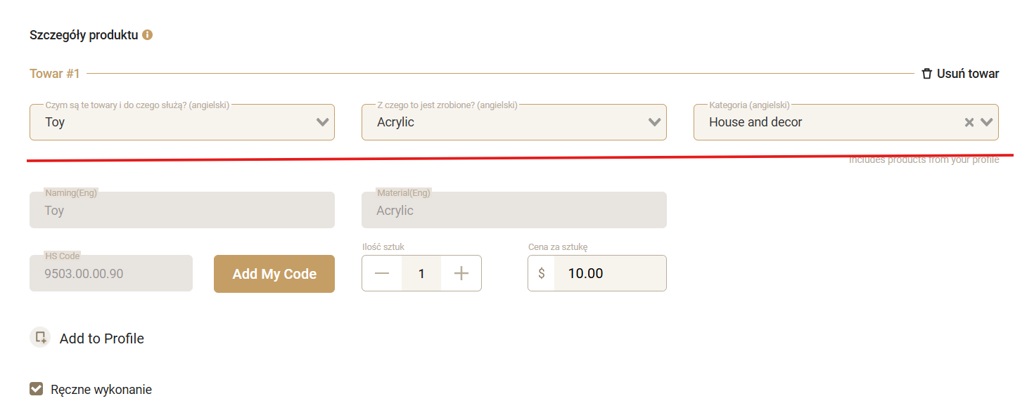 Wybierz opis produktu, podaj ilość i cenę. Jeśli system nie wyświetla kod HS, zgłoś sytuacje do obsługi klienta (Support).
