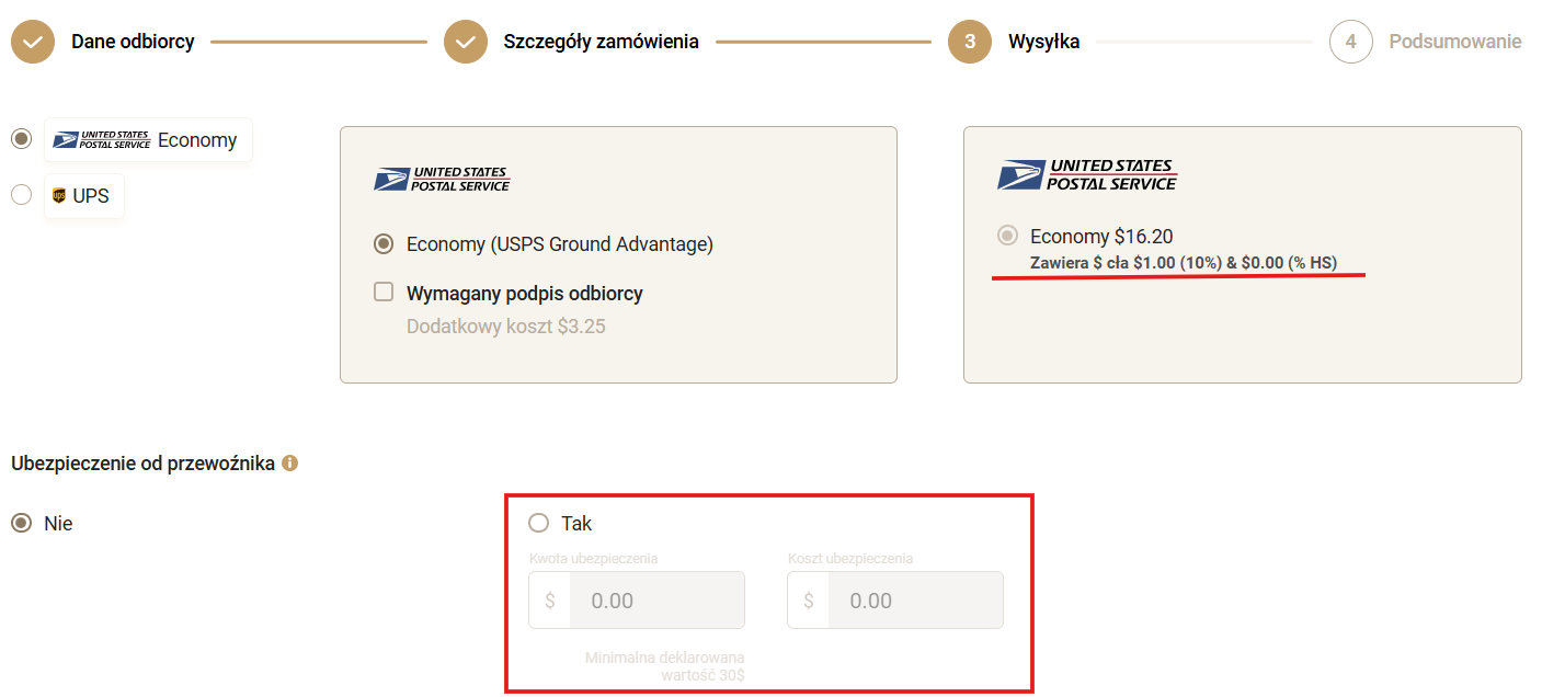 System automatycznie obliczy koszt w zależności od wymiarów, wagi i adresu dostawy odbiorcy; wybierz opcję, która najbardziej Ci odpowiada. W razie potrzeby możesz wybrać dodatkowe ubezpieczenie oferowane przez przewoźnika; w tym celu należy zadeklarować wartość towaru