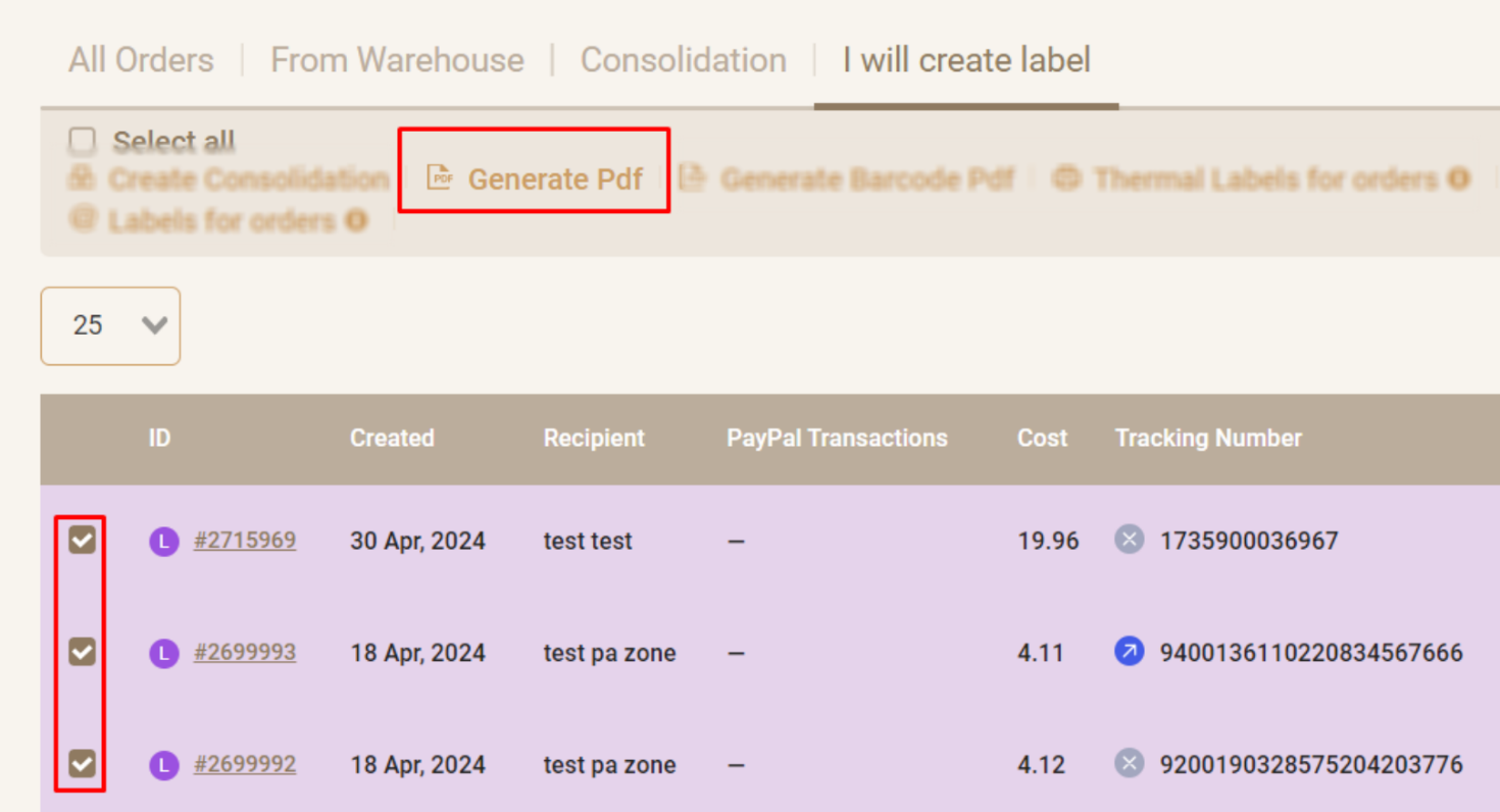 Jeśli chcesz pobrać etykiety dla wielu zamówień jednocześnie, zaznacz zamówienia i kliknij przycisk „Utwórz PDF”