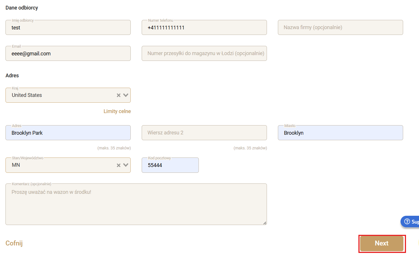 Dane odbiorcy zostaną automatycznie uzupełnione; w razie potrzeby możesz je samodzielnie skorygować po sprawdzeniu informacji kliknij przycisk „Next”