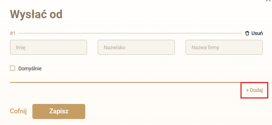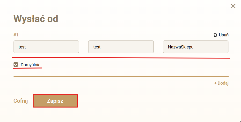Należy podać imię, nazwisko oraz nazwę sklepu/firmy. Aby system automatycznie wybierał dane tylko jednego nadawcy kliknij przycisk „Domyślnie” w utworzonym profilu. Wypełnij pola i naciśnij przycisk „Zapisz” .