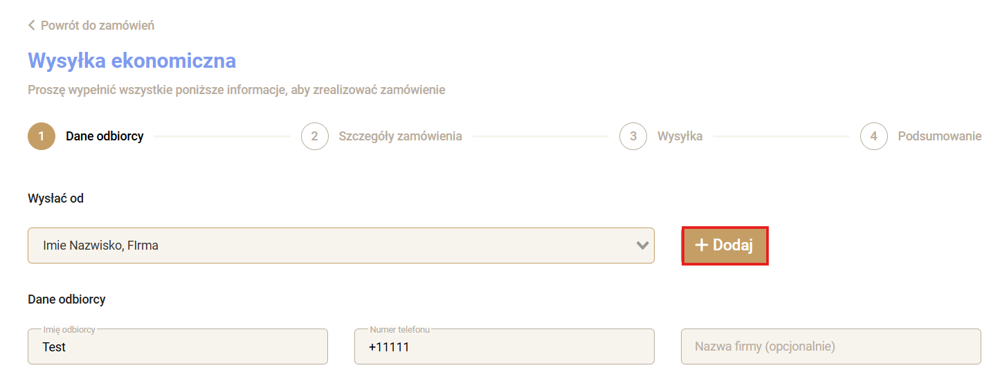 Podczas tworzenia zamówienia system wyświetli okno, w którym należy podać dane osobowe, które pojawią się na etykiecie przesyłki. Kliknij przycisk „+Dodaj”.