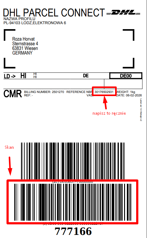 Wysyłając przesyłkę za pośrednictwem placówki pocztowej DHL, możesz zeskanować kod kreskowy z etykiety lub wpisać numer ręcznie: