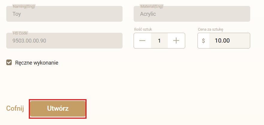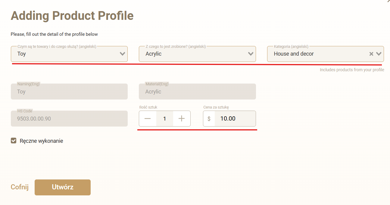 Dalej zobaczysz pola które nałeży wypełnić. Są to: kategorię, produkt, dodaj materiał, ilość i cenę za jednostkę produktu. Sprawdż czy wyświetla się HS kod. Jeśli kod nie pojawił się automatycznie, skontaktuj się z działem pomocy techniczne (Support)