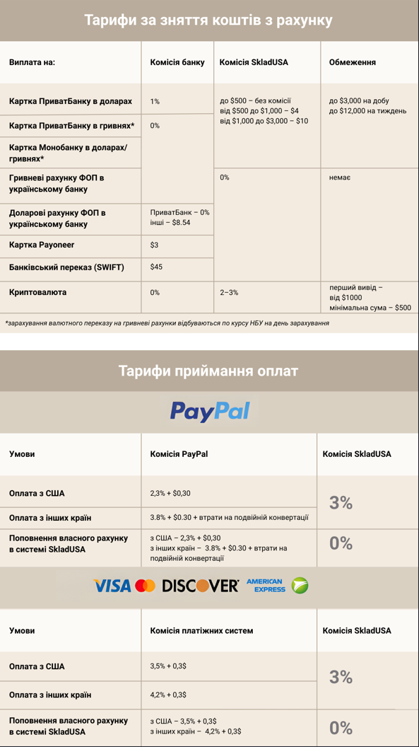 Адміністрація Skladusa несе за собою право тимчасово припинити виплати з балансу, якщо клієнт має два або більше невирішені кейси, відкритими його покупцями у PayPal або через банк.1) За умови якщо ви відправляєте свої замовлення через сервіси Skladusa, сума розраховується наступним чином - Поточний баланс за мінусом суми не відправлених транзакцій (без доданих трек номерів) 2) За умови якщо ви відправляєте свої замовлення національними поштовими операторами, сума розраховується наступним чином - Поточний баланс за мінусом суми не відправлених транзакцій (без доданих трек номерів) та за мінусом транзакцій які ще в дорозі (трек номер додано, але ще не доставлено) 3) При відправці сторонніми перевізниками, без трек-номеру та відгуку від покупця, вивід доступний після 180 днів з моменту отримання транзакції.